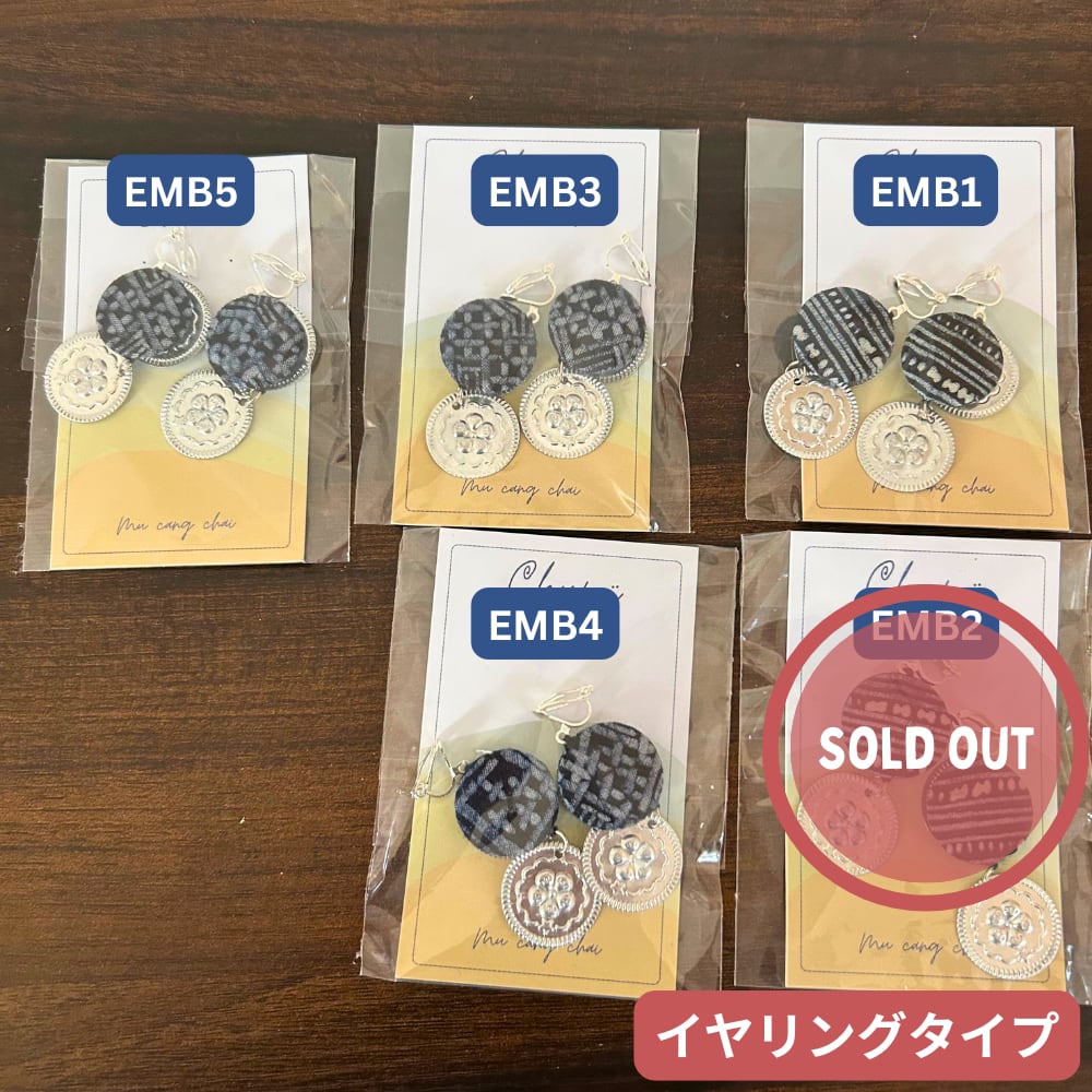 藍染め布とシルバー(アルミ製)のコインを使用。部品部分には、亜鉛合金を使用しておりますので、金属アレルギーの方は着用をお控えください。少数民族モン族の文化を感じることができるアイテムです。製造はベトナムのムーカンチャイで、モン族の伝統的な技術によって1つ1つハンドメイドで作られています。